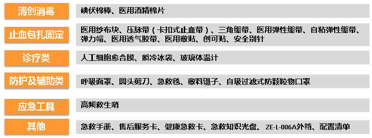 1、配置內(nèi)容物側(cè)重于工作、辦公、生活場所需的醫(yī)療急救用品。